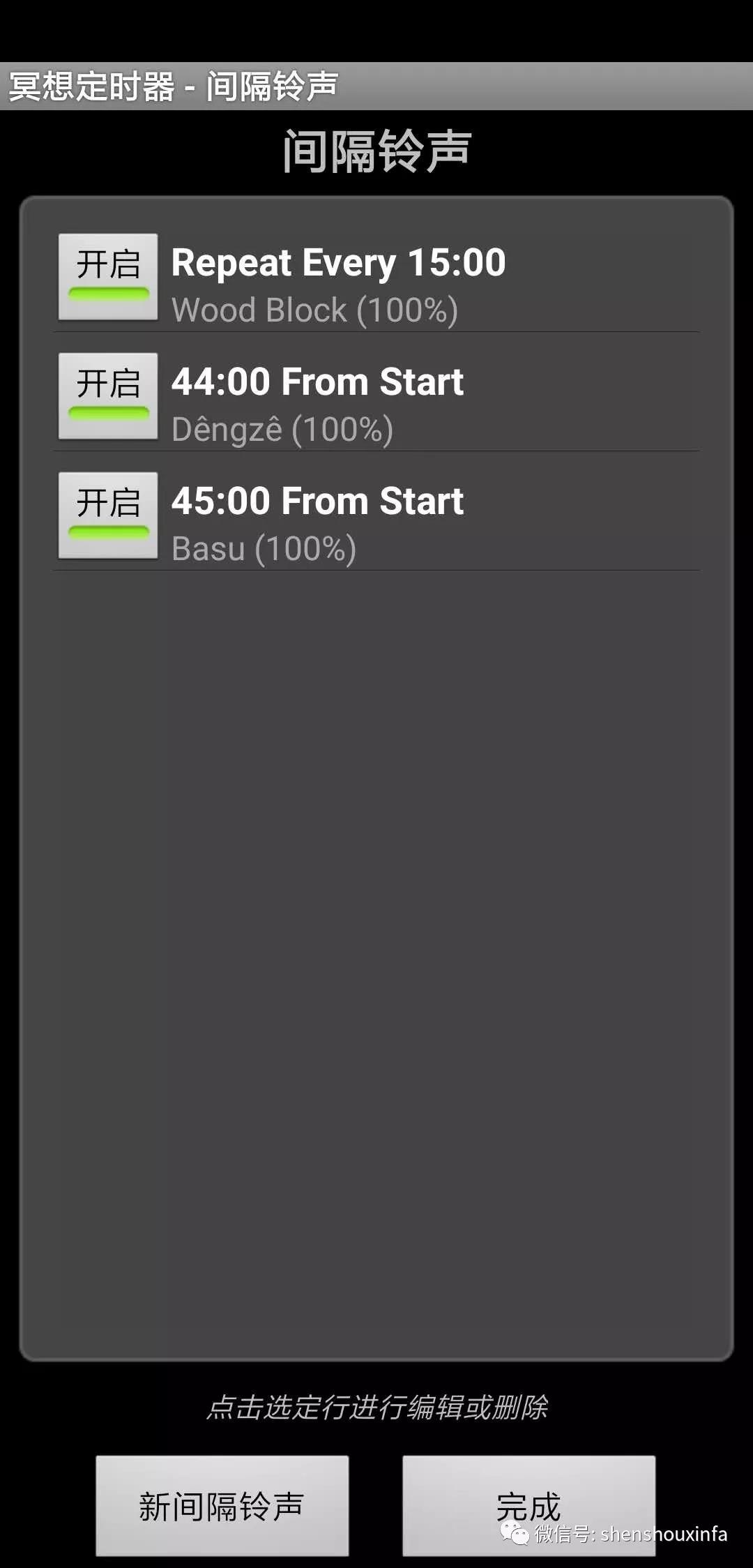 下图是一个配置示范,比较适合初学者。第一个间隔计时是全程每隔15分钟播放木鱼声提醒,适合初学者用来掌握时间,有时疼痛难忍想要放弃时,听到只剩15分钟时,可能就能坚持下来了。第二个是44分钟时播放一个低沉的引磬声,一分钟后即第45分钟,播放标准引磬声。最后,在90分钟结束时,也会播放标准引磬声。建议已经有一定基础的练习者,可以尝试关闭每15分钟的提醒,因为有时可能在专注时,反而会因为提醒分心。